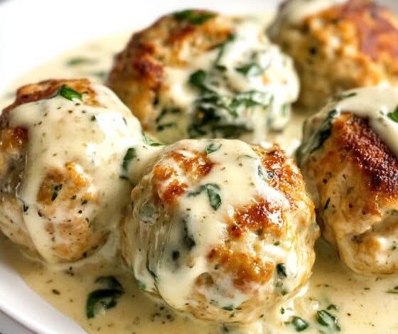 Baked Chicken Ricotta Meatballs with Spinach Alfredo Sauce