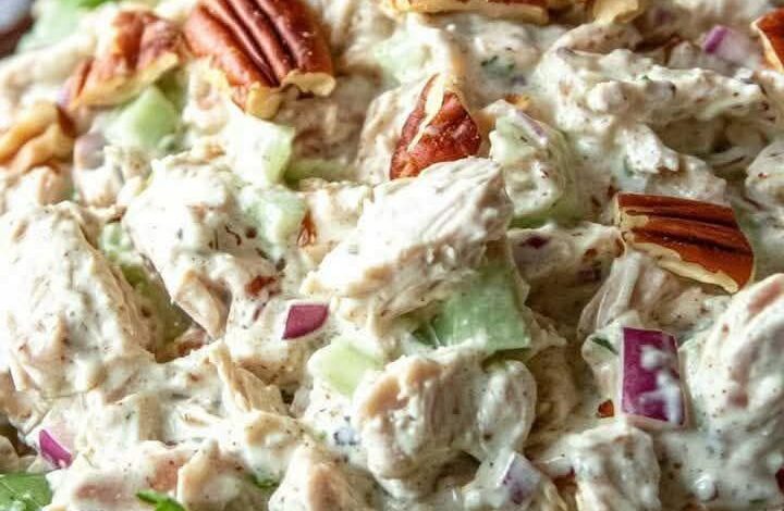 This chicken salad is creamy, nutty, and slightly sweet with a satisfying crunch from the pecans and celery. The grapes or cranberries offer a refreshing contrast to the rich dressing, while Dijon and vinegar add a subtle tang. It’s a wholesome, hearty salad that feels indulgent but is full of real, simple ingredients — the kind of timeless recipe that earns its “famous” label at family gatherings and luncheons alike.
