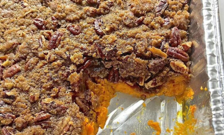 · Sprinkle the pecan streusel topping evenly over the sweet potato base.